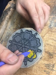 工法としては、梨地彫刻という技法です。紋の外側のラインを少し深めに彫刻した後、図柄の部分をさらっと砂を当てる(彫刻)ことで、梨地彫刻となります。
